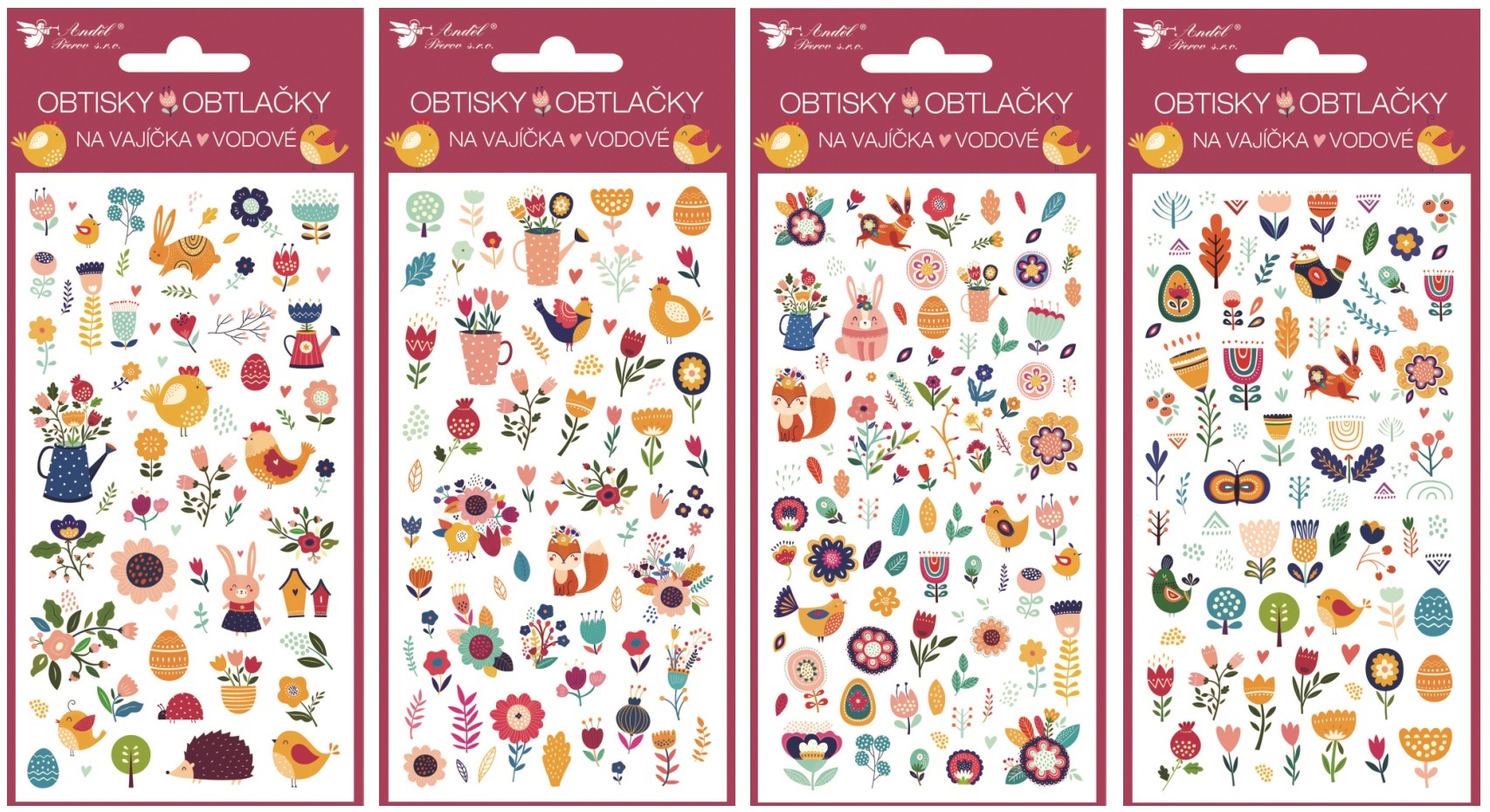 Klasické obtisky, které se aktivují vodou, ozdobí vajíčka jarními motivy. Stačí vybrat motiv, vystřihnout, ponořit pod hladinu, uvolnit obrázek a přenést na vajíčko. Po uschnutí obtisk pevně přilne na povrch. Cena je za 1 ks. Do balíčku bude vložen aktuálně dostupný, skladový kus.