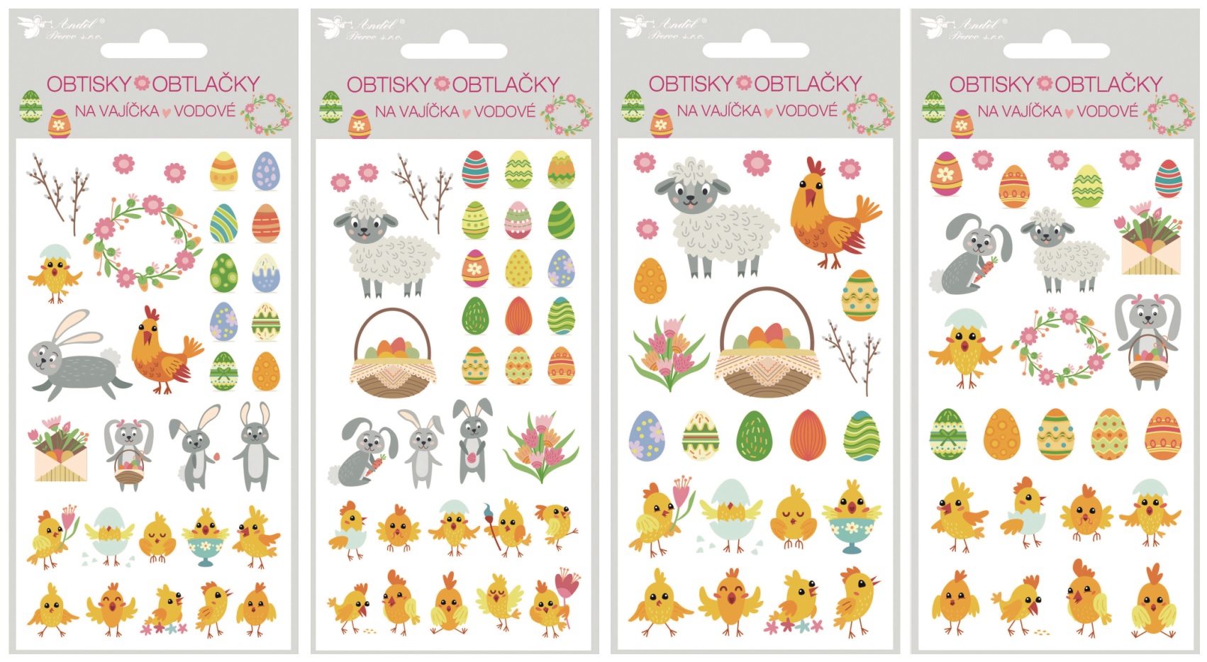 Klasické obtisky, které se aktivují vodou, ozdobí vajíčka jarními motivy. Stačí vybrat motiv, vystřihnout, ponořit pod hladinu, uvolnit obrázek a přenést na vajíčko. Po uschnutí obtisk pevně přilne na povrch. Cena je za 1 ks. Do balíčku bude vložen aktuálně dostupný, skladový kus.