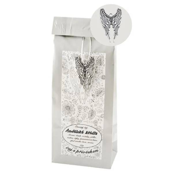 Ovocný aromatizovaný sypaný čaj v krásném dárkovém balení s přívěškem andělských křídel Motiv přívěšku se může lehce lišit od fotografie podle akutálních zásob. Složení:ibišek, rozinky, jablko, malina, šípek, pomerančová kůra, plod černého bezu, aroma 50g