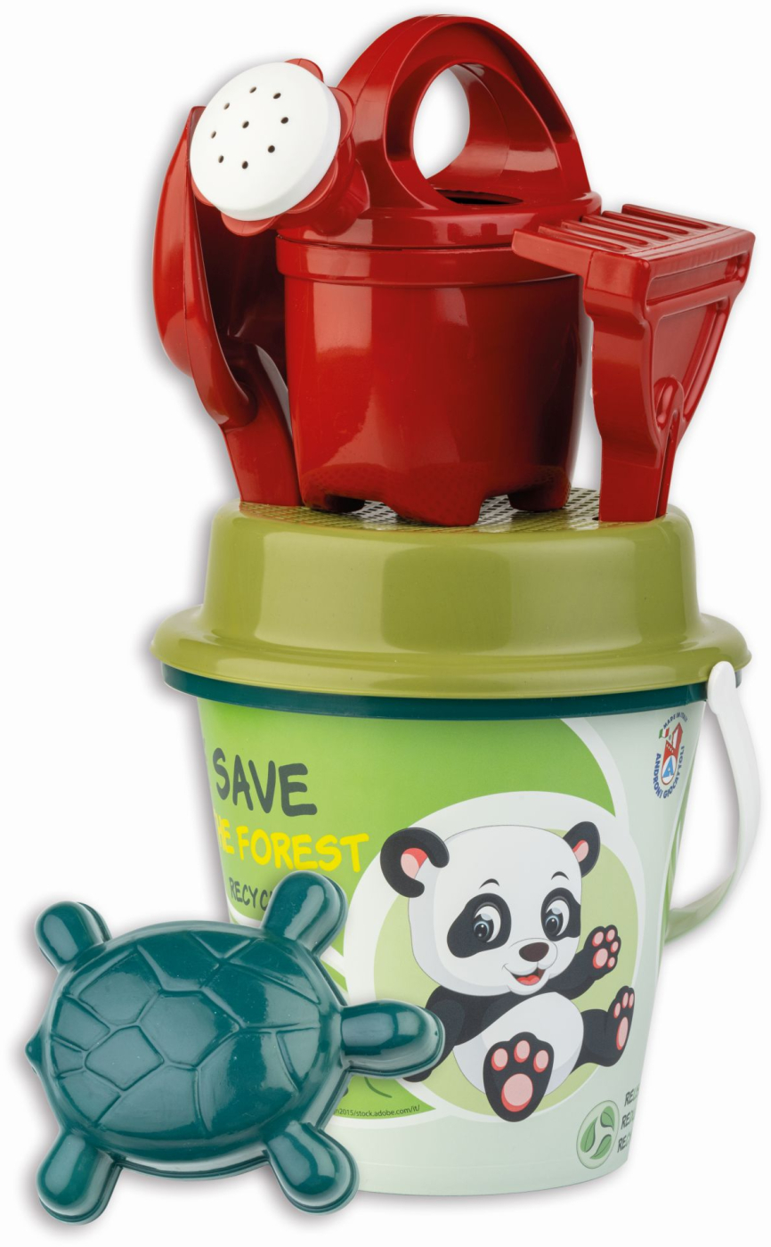 6dílná sada na písek, vyrobená z kvalitních recyklovaných plastů v Itálii. Obsahuje: Kyblík, konvičku 0,5 l, sítko, lopatku, hrabičky a tvořítko ve tvaru želvičky. Kyblík: průměr 17 cm, výška 16 cm. Sada: výška 35 cm, váha 0,42 kg. Doporučený věk od 12 měsíců.