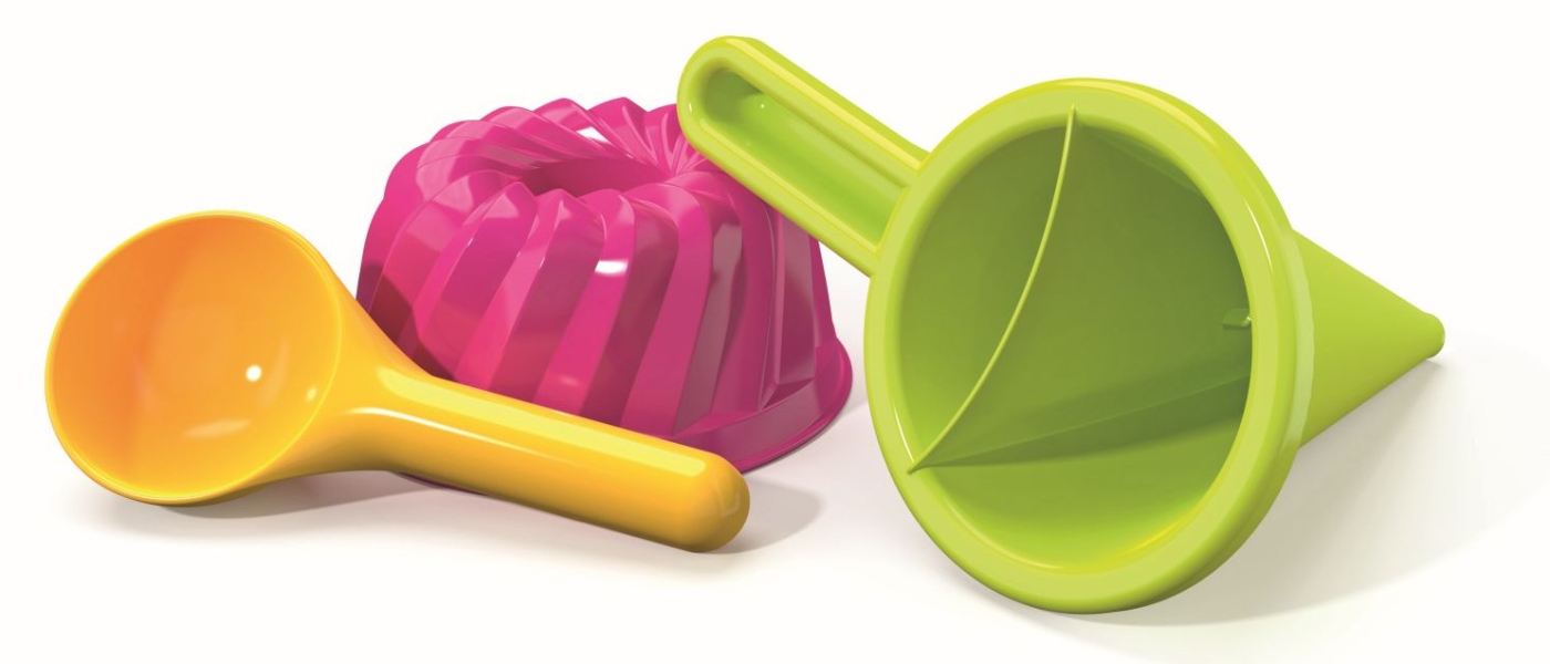 3dílná sada na písek, vyrobená z kvalitních plastů v Itálii. Obsahuje: 1 dekoraterský trychtýř pro míchání písku a vody a vytáření kreativních muffinů a jiných výtvorů, 1 tvořítko ve tvaru bábovky, 1 kopečkovač na zmrzlinu. Baleno v síťce o rozměrech 11 x 18x 17 cm. Váha: 0,122 kg. Doporučený věk od 10 měsíců.