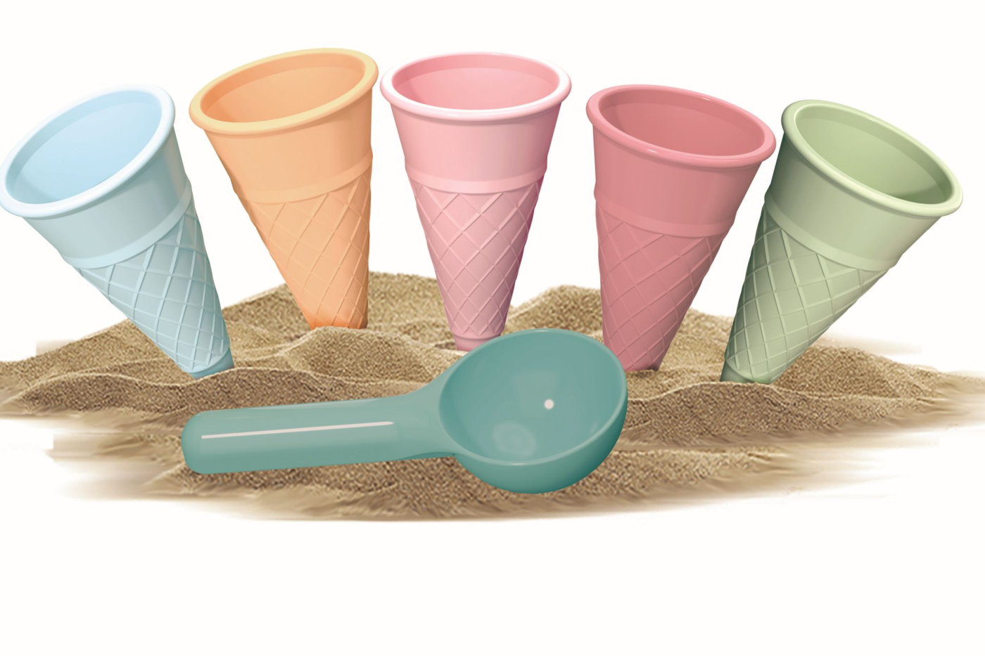 6dílná sada tvořítek na písek - zmrzlina. Vyrobeno v Itálii z kvalitních plastů. Obsahuje pět kornoutků a kopečkovač na zmrzlinu. Baleno v sáčku o rozměrech 15 x 31 cm. Váha: 0,114 kg. Doporučený věk od 10 měsíců.