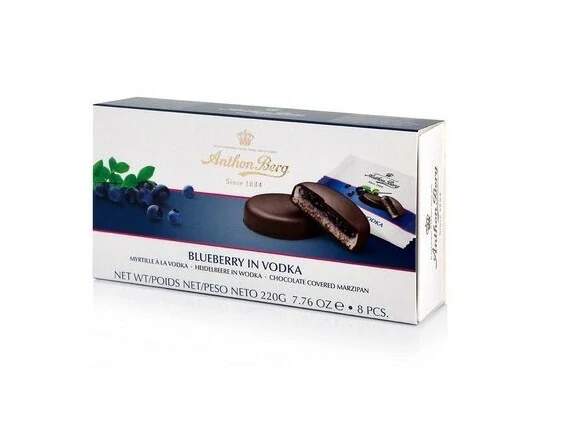 Hořká čokoláda s marcipánem (41 %) a náplní (25 %) s borůvkami ve vodce. Nevšední čokoládový dárek pro opravdové gurmány Složení: Cukr, kakaová hmota, borůvky 13 %, mandle 11 %, meruňková jádra, glukózový sirup, vodka 3 %, kakaové máslo, mléčný tuk, zahušťovadlo (pektin), emulgátor (řepkový lecitin), kyselina (kyselina citronová), konzervanty ( kyselina sorbová, sorban draselný), přírodní aroma. Alergeny: Obsahuje mandle, mléko Kakao min.50% Výživové hodnoty na 100g : Energetická hodnota : 1858 kj / 444 kcal Tuky 22 g z toho nasycené mastné kyseliny 7,7 g Sacharidy 50 g z toho cukry 41 g Bílkoviny 6,7 g Sůl 6,7 g Země původu: Dánsko Výrobce: Anthon Berg, Toms Alle 1, 2750 Ballerup, Dánsko Obsah: 220 g Rozměry: Výška 10 cm x šířka 19 cm x hloubka 5 cm
