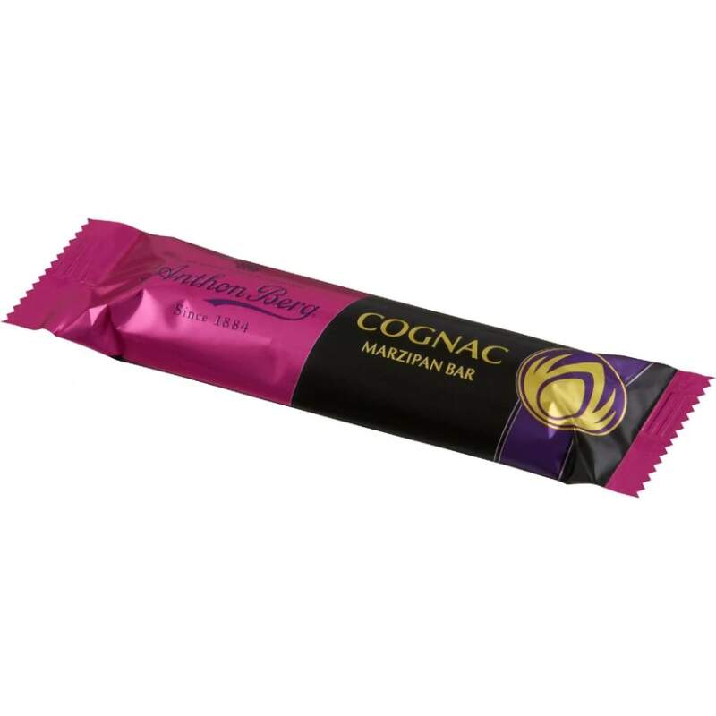 Anthon Berg Marcipánová tyčinka s koňakem s obsahem alkoholu Složení: cukr, mandle 27%, glukózový sirup, kakaová hmota, Cognac 7%, kakaové máslo, kukuřičný škrob, mléčný tuk, konzervant (kyselina sorbová), emulgátor (lecitin). Hořká čokoláda obsahuje min. 50% kakaové sušiny. Alkohol: 3% Hmotnost: 40g