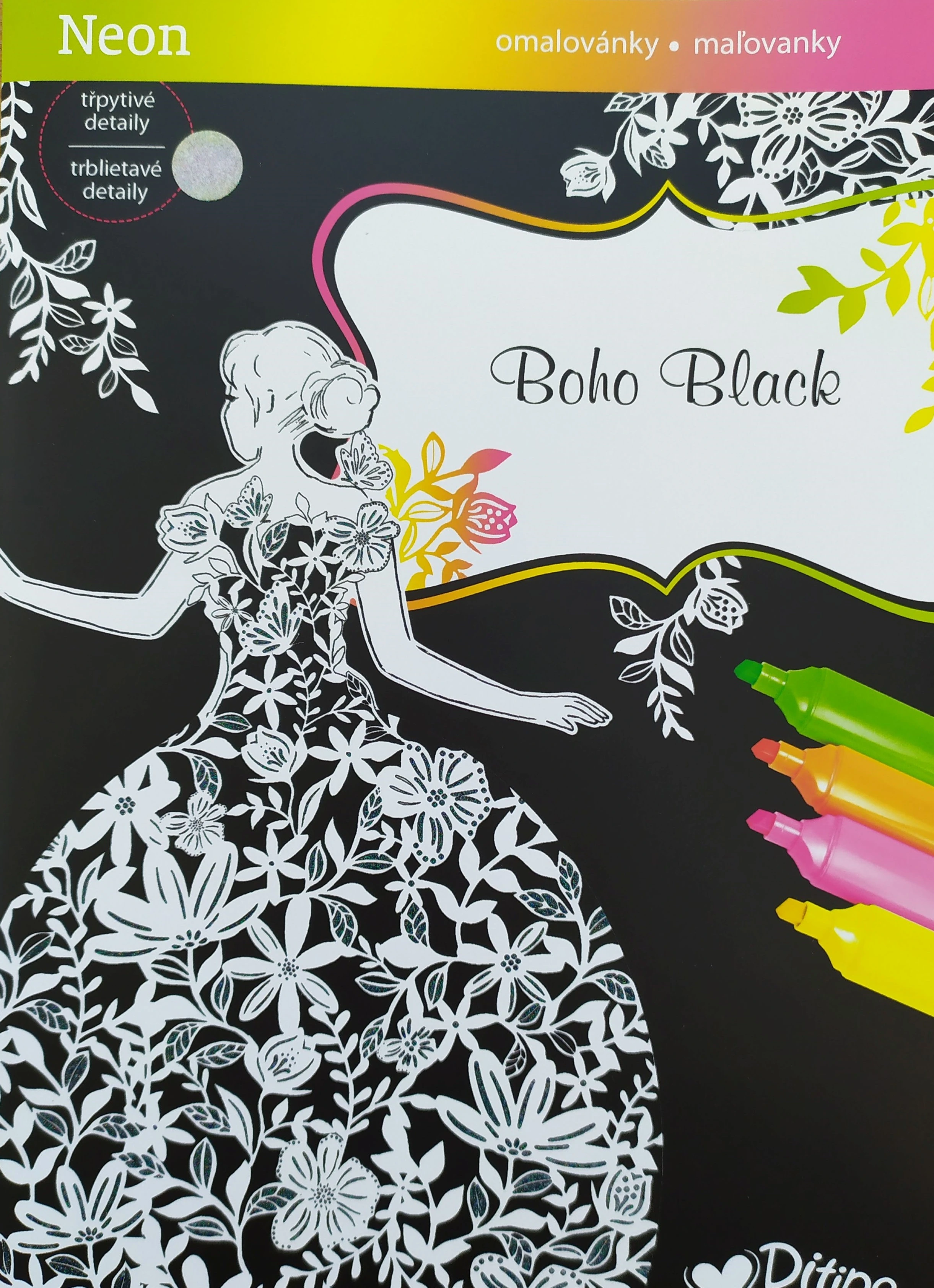 Kouzelné omalovánky s unikátním třpytkovým pozadím. Každá stránka je opatřená třpytkami, které zářivě vyniknou nejen při malování pastelkami, ale také akvarelovými barvami či fixami. Třpytky vytváří na stránkách jedinečný 3D efekt, díky čemuž po vymalování vznikne unikátní obrazek, který je možné z vazby vyjmout (stránky jsou perforované), zarámovat a pověsit na stěnu jako vkusnou dekoraci. Motiv tohoto sešitu je něžný, romantický v duchu zasněných žen a dívek. Černé pozadí ještě víc umocní třpytkový efekt. Vybírat můžete i z dalších třpytkových omalovánek Ditipo.