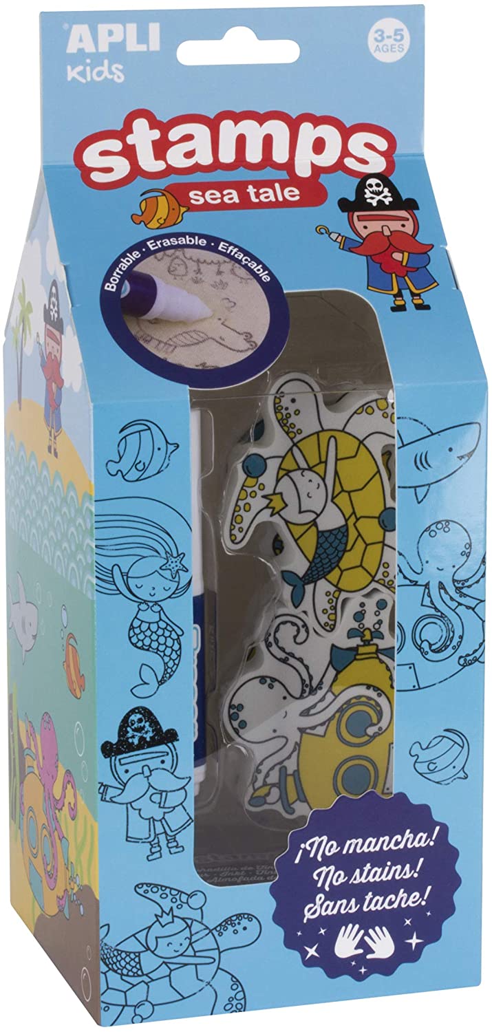 Razítkování děti baví, obzvláště v dlouhém čase karantény. Dárkové balení razítek od značky APLI, obsahuje vše, co je třeba pro zábavu s razítky a ještě něco navíc. V sadě naleznete 6 měkkých razítek, která jsou vhodná do dětské ručky, s oblíbenými motivy podmořského života. Dále je v balení razítkovací poduška, napuštěná modrou, netoxickou barvou s atestem pro malé děti. Poslední součástí je speciální "vychytávka" - zmizík, kterým lze barva snadno odstranit nejenom z papíru, ale také z textilu či nábytku. Sada je vhodná pro děti od 18 měsíců. Balení obsahuje 8 ks v dárkové krabičce.