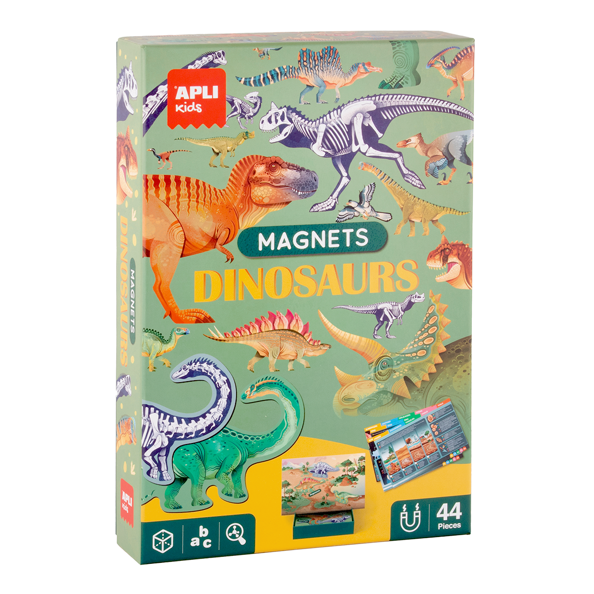 Vydejte se na cestu do pravěku a objevte úžasný svět dinosaurů! Edukační magnetická sada pro děti obsahuje magnety a magnetickou podložku a informační karty v češtině (a dalších 18 jazycích), která dětem přiblíží zábavnou formou důležitá fakta o dinosaurech. Elegantní balení, skvělý dárek pro zvídavé děti.obsah sady: 1 ks podložka, 44 magnetů, edukativní brožura v češtině (a dalších 18 jazycích)rozměr podložky: 18 × 28 cmmotiv dinosaurůedukativní a tematická hrapro děti od 5 letobsah balení: 1 sada