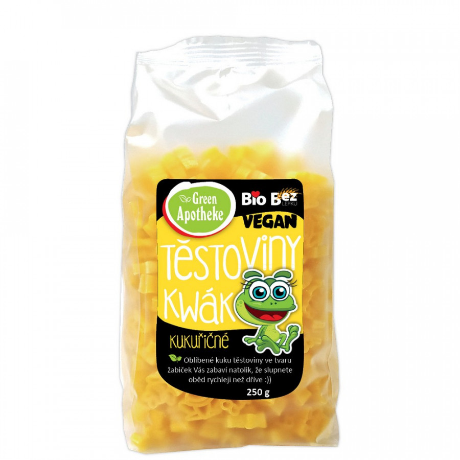 Těstoviny Kwák BIO Kukuřičné bezlepkové 250g Oblíbené kuku těstoviny ve tvaru žabiček Vás zabaví natolik, že slupnete oběd rychleji než dříve :))Hravé bezlepkové těstoviny z kukuřičné mouky. Originální tvar v podobě žabek pro zpestření Vašeho jídelníčku. Složení: BIO kukuřičná mouka. Může obsahovat stopy soji Návod na přípravu: Těstoviny vaříme v osolené vodě s kapkou oleje (v poměru 100 g těstovin/ 1l vody) za občasného míchání 9-10 minut. Po dosažení požadované měkkosti ihned scedíme, propláchneme studenou vodou a zakápneme olejem. Skladování: Skladujte v suchu při teplotě do 25°C a relativní vlhkosti vzduchu do 70%. Nevystavujte přímému slunci. Výživové údaje ve 100 g výrobku: Energetická hodnota 1528 kJ/ 360 kcal, tuky 2,0 g (z toho nasycené mastné kyseliny 0,6 g), sacharidy 71,0 g (z toho cukry 0,6 g), bílkoviny 8,5 g, sůl 0,015 g. Hmotnost netto: 250g Výrobce: MEDIATE, s.r.o., Libchavy 561 16, ČR, www.apotheke.cz