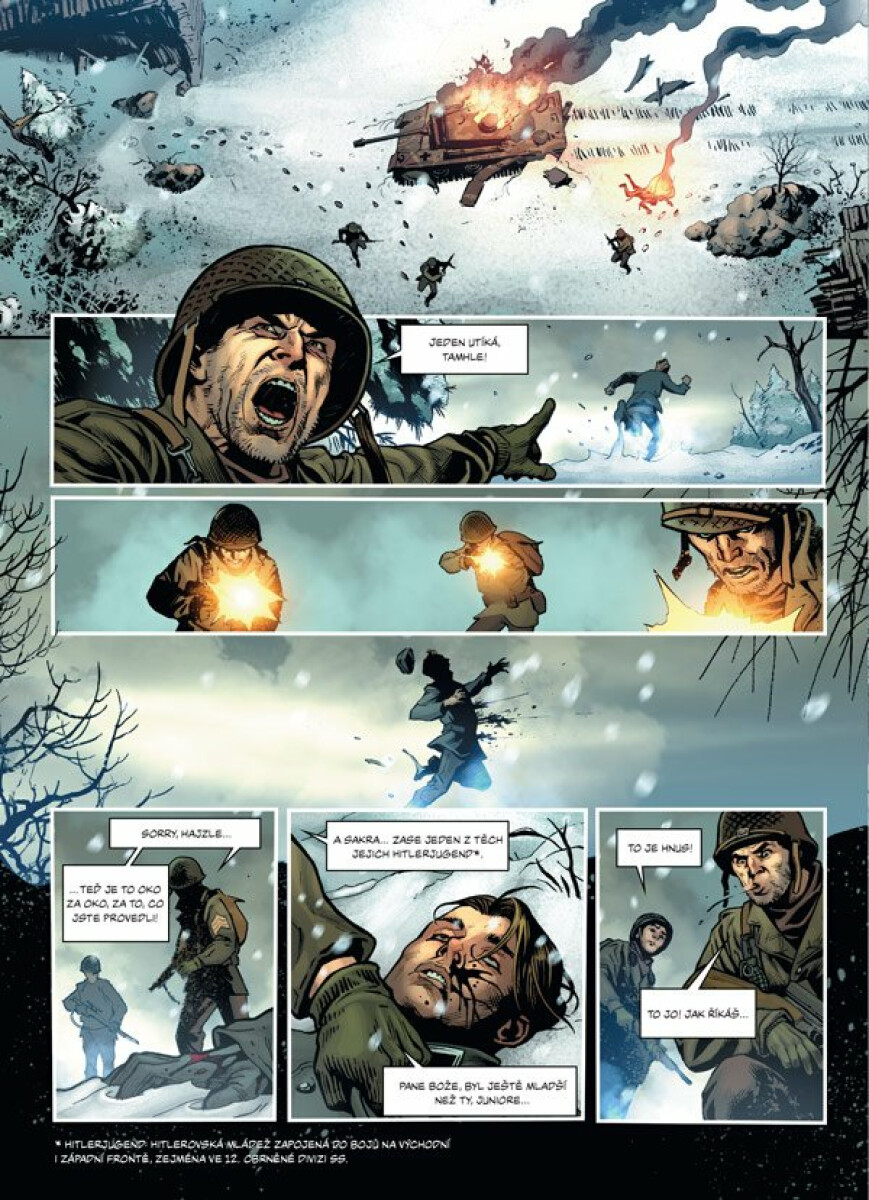 Příběh ze sněhem zavátých belgických Arden, kde se v zimě roku 1944 Němci pokusili o zázrak.V dalším dílu komiksů ze série Velké tankové bitvy se ocitnete uprostřed ledového pekla poslední velké německé protiofenzivy. Spolu s posádkou slavného tanku Panther Aufs. G zažijete prudké boje s Američany v zápase, který vešel do dějin jako bitva v Ardenách. Hitlerova sázka na ofenzivu Německé armády se po vylodění Spojenců v Normandii v červnu 1944 už jen bránily. Veškerou iniciativu přenechávaly nepříteli a zmáhaly se maximálně na obrany a organizovaný ústup. Vůdce však byl přesvědčen, že je třeba navázat na tradici blitzkriegu, tedy strategii rychlých a nečekaných ofenziv. Přes Ardeny do Antverp Německá armáda se v prosinci 1944 pokusila zopakovat tažení z roku 1940, kdy se německé tanky prodraly hustě zalesněným pohořím Ardeny a obešly francouzské a britské síly, čekající útok ze západněji položených nížin. Cílem byly Antverpy, odkud přicházely zásoby pro Spojence na západní frontě. Jenže doba se změnila a Německo bylo na pokraji sil. Pět mužů a kočka Komiksy řady Velké tankové bitvy jsou především příběhy lidí a tanků, kteří v nich bojovali. Tento díl se zaměřuje na příběh posádky jednoho z Pantherů, které měly Němcům bitvu vyhrát. Její muži byli vybráni pro zvláštní misi, ale musí se vypořádat s nepříznivým počasím, nedostatkem paliva, slabou leteckou podporou i celkovou únavou z války. Podaří se jim to, nebo přežije jen jejich kočka?