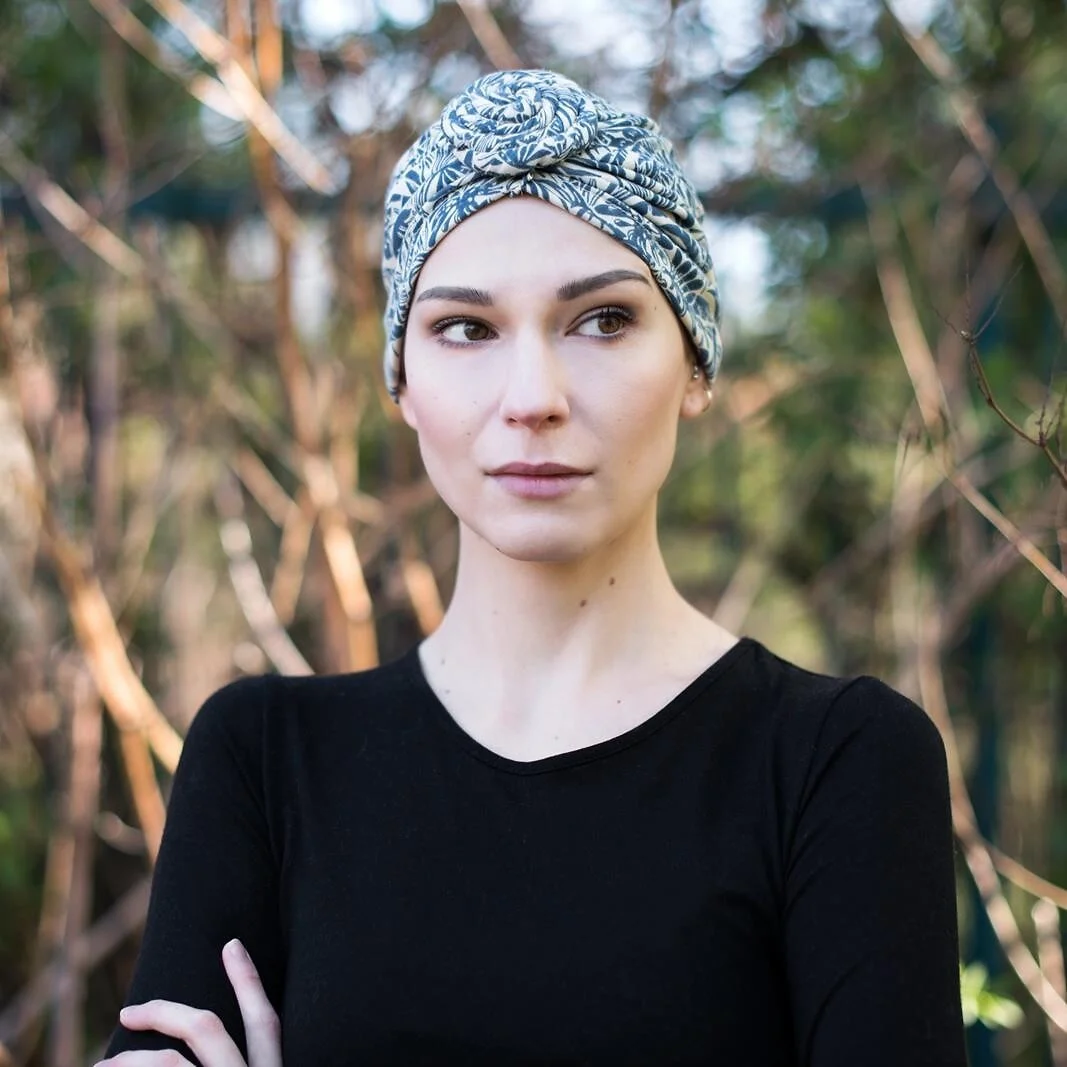 Původní čepice-turban - vytvořený pro ženy po chemoterapii nebo s trichologickými problémy - měkký, vzorovaný modal - dobře přiléhá k hlavě, mírně elastický - řasení a ozdobný "šnek" na přední straně - ideální pro ležérní i elegantní styling Složení: 95 % modal, 5 % elastan