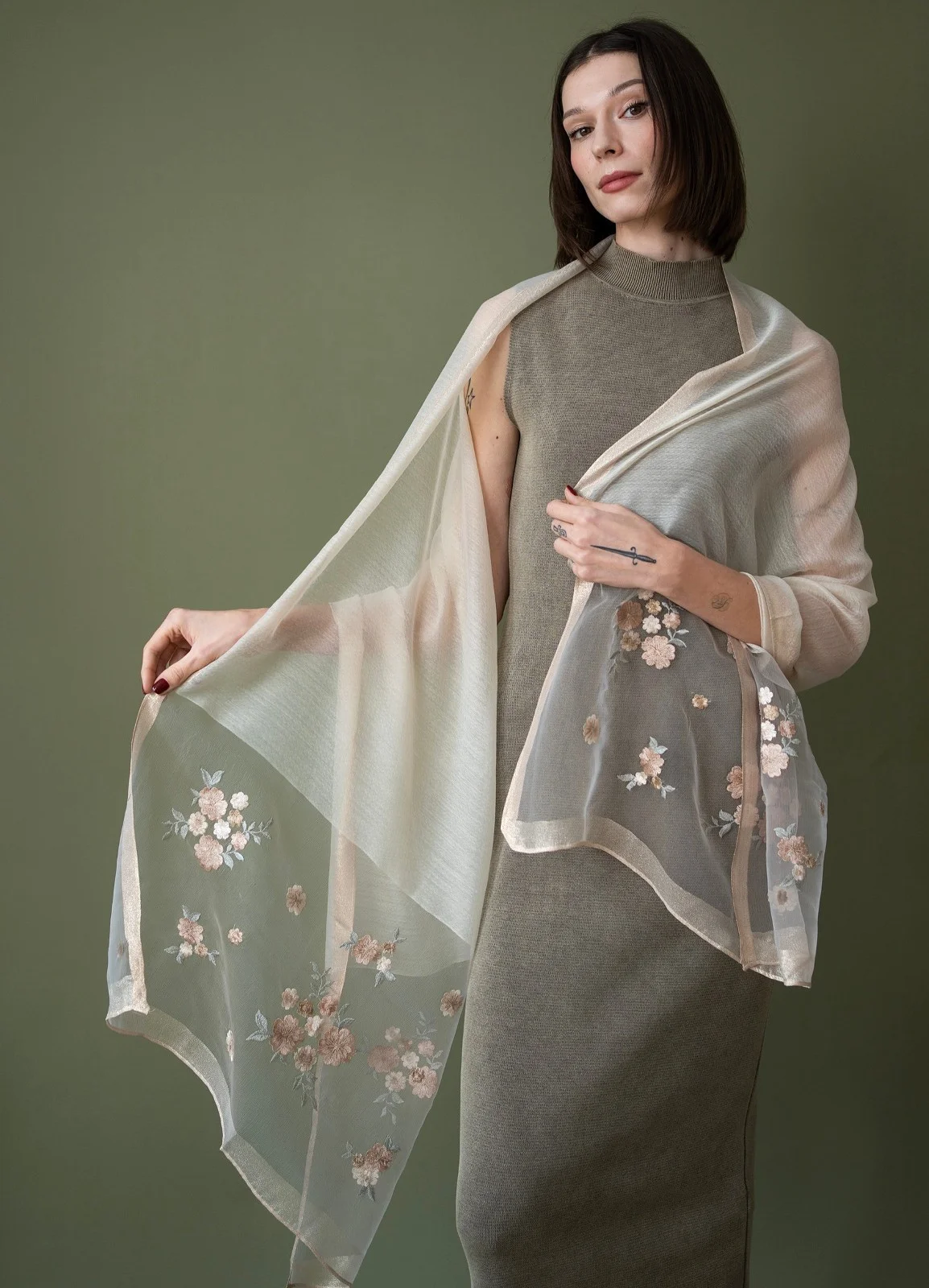Elegantní šátek - tenká, poloprůhledná tkanina - ozdobné vyšívané květy - lesklý povrch - skvělý doplněk k šatům a pro všechny slavnostní příležitosti Složení: 100% polyester