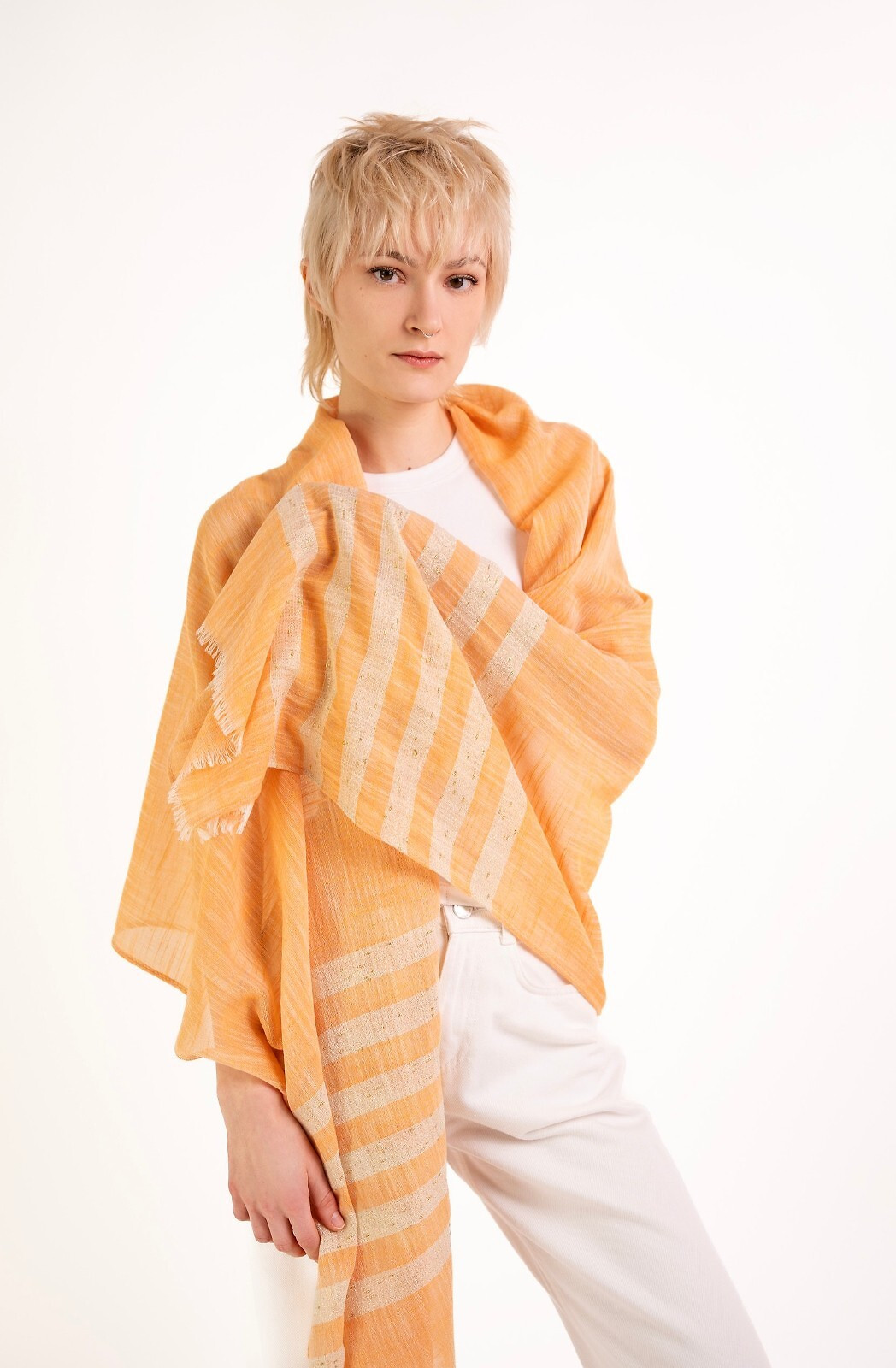 Tenký, vzdušný, elegantní šátek - zakončený jemnými střapci - skvělý jak pro přechodné období, tak jako doplněk během letní plážové sezóny - textura látky připomíná len - má jemné ozdobné proužky zakončené zlatou nití, která krásně odráží světlo Složení: 50 % bavlna, 50 % polyester