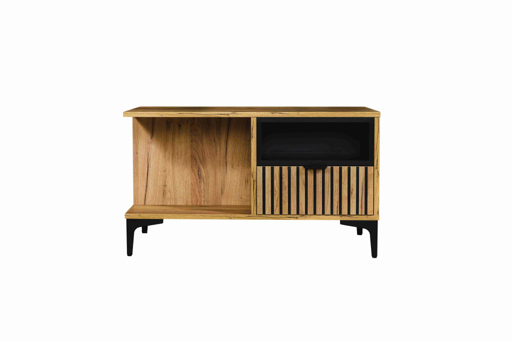 Konferenční stolek Piano 1S zlatý dub/černá - konferenční stolek v dekoru zlatého dubu s černými prvky kombinuje moderní design s praktickými prvky a kvalitním zpracováním. Korpus je vyroben z odolné MDF desky o tloušťce 18 mm v elegantním dekoru zlatého dubu, který doplňují stylové černé prvky. Zásuvka je vyrobena z MDF s drážkovaným dekorem, který dodává nábytku originální vzhled. Konferenční stolek disponuje také otevřeným úložným prostorem v černém dekoru. Díky pántům s integrovaným tlumením je zavírání zásuvky tiché a plynulé. Kovové černé úchyty a pevné kovové nohy podtrhují moderní vzhled a zároveň zajišťují stabilitu a dlouhou životnost. Konferenčí stolek se hodí do domácího prostředí obývacích pokojů, dětských pokojů, hostinských pokojů, ale své místo si také najde v chatách a chalupách.