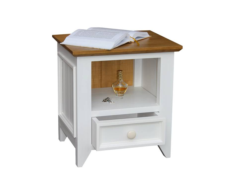 Noční stolek FLEUR-SN1P (Bílá) je typem menšího nočního stolečku s jednou zásuvkou a otevřenou policovou částí. Noční stolek je z kolekce nábytku FLEUR, která je stylizována do francouzského stylu, který neomrzí ani po mnoha letech. Výjimečnost celé kolekce je dána použitými materiály, kde základní kostra stolku je vyrobena z bukového masivu a horní deska z dubového dřeva. Barevnosti nábytku je docíleno tak, že bukové dřevo je natřeno akrylovou barvou a dubové horní desky olejem, aby více vynikla přirozená krása dřeva. Noční stolek si najde své místo nejen v moderních, ale i klasičtěji zařízených interiérech, proto je pořizován nejen do ložnic našich bytů a domovů, ale také do apartmánů nebo na chaty a chalupy. Nábytkem z kolekce FLEUR si můžete zařídit celý pokoj, byt či rodinný dům, pokud jste milovníky přírodních materiálů a tohoto stylu :)