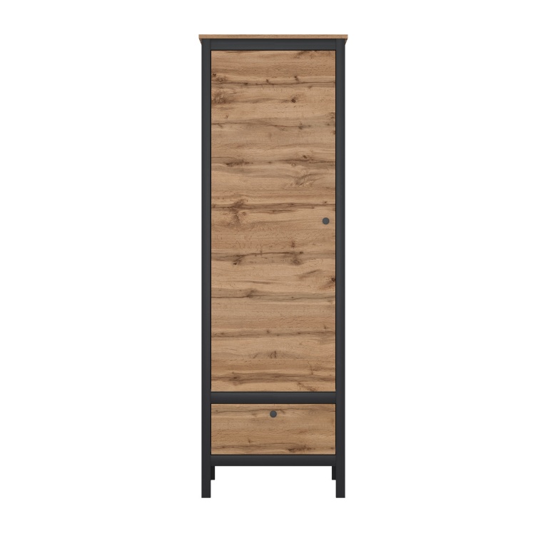 Regál LOFT-1D1S (Dub wotan) s dvířkovou částí, kde jsou vloženy 3 police a se zásuvkou na kuličkových pojezdech ve spodní části, je součástí velmi atraktivní kolekce nábytku. Na první pohled hned zaujme černými konturami po celém obvodu každého dílu, které zdůrazňují i jednotlivé části úložných prostor. Vyšší nožky nábytku jsou foliované a zároveň tvoří svislé obvodové linie. Kombinace dekoru dub wotan a černých kontur dodává na důležitosti a eleganci, proto se nábytek hodí nejen do obývacího pokoje, ale i do reprezentačních prostor, kanceláří a pracoven. Nábytek je vyroben z LDTD desek. Kolekce LOFT.