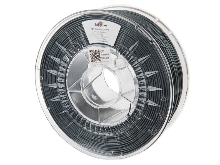 Filament Spectrum ASA 275 je profesionální materiál určený pro použití na stolních 3D tiskárnách. Složení ASA (akrylonitril-styren-akrylát) bylo speciálně upraveno tak, aby byl materiál pružnější, měl lepší tokové parametry, lepší adhezi mezi tiskovými vrstvami a docházelo u něj k menšímu smršťování. Jednou z hlavních výhod úpravy materiálu ASA 275 je naprosté zjednodušení tiskových parametrů. Výrobce Spectrum uvádí, že se tento technický materiál tiskne při podobných teplotách jako materiál PLA. Můžete tak tisknout velké modely bez rizika deformace během chladnutí a to i poměrně vysokou rychlostí tisku.Podmínky při tisku jakéhokoliv filamentu se liší dle nastavení a typu použité 3D tiskárny. U materiálu ASA 275 to není nutné, ale pokud Vám i přes všechny uvedené výhody materiál nedrží na podložce, odmastěte ji a aplikujte sprej či lepidlo pro podporu přilnavosti. ASA 275 je materiál odolný vůči UV záření a jiným povětrnostním podmínkám. Je vhodný pro tisk prototypů, funkčních výrobních nástrojů a prvků, které musí odolat měnícím se povětrnostním podmínkám, ale využije jej i pro objekty každodenní potřeby. Výhody ASA 275: S vláknem ASA 275 získá váš 3D model: - vynikající odolnost vůči venkovnímu prostředí- tepelný odpor- lesk tiskové plochy- odolnost vůči UV záření- dokonalé spojení vrstev- možnost tisku na stolních tiskárnách bez vyhřívané komory ObalVlákno je navinuto na čisté průhledné cívce. Každá cívka obsahuje informace o typu materiálu, průměru a doporučené teplotě tisku. Vlákno je vakuově baleno společně se silikagelem pro pohlcování vlhkosti. Uvnitř balení je také přiložen návod k použití. Celý výrobek je balen v originálním balení firmy Spectrum Filaments. Obecné informaceBarva: Dark GreyRAL:Průměr: 1,75 mmRozměrová tolerance: ± 0,05 mmTeplota tisku: 200-240 °CVyhřívaná podložka: 40-60 °CČistá hmotnost: 1000 gFyzikální a termální vlastnosti základního materiáluSpecifická hmotnost: MFR (210 °C / 2,16 kg), g/10 min: Teplota tepelného přechodu:Pevnost v tahu při přetržení:Pevnost v tahu: Modul pružnosti v tahu: Rázová pevnost: