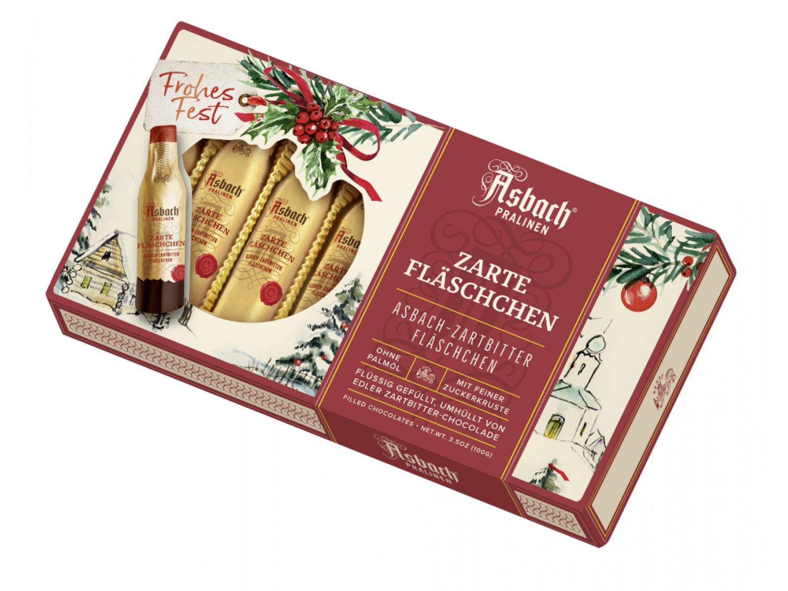 Lahvičky z jemné hořké čokolády 54% plněné originál brandy ASBACH 46% s cukrovou krustou ve vánočním balení. Obsah kakaové sušiny nejméně 60% Složení: cukr, kakaová hmota, brandy (8,9%), voda, kakaové máslo, emulgátor (slunečnicový lecitin) Může obsahova stopy soji, vajec, lískových oříšků a mléka Rozměry v mm: 90×170×20 100g