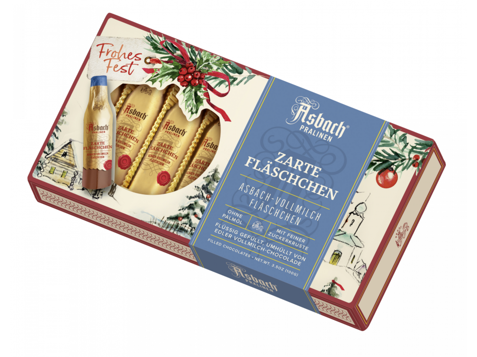 Lahvičky z jemné mléčné čokolády plněné originál brandy ASBACH 46% s cukrovou krustou ve vánočním balení. Obsah kakaové sušiny nejméně 36% Složení: cukr, kakaové máslo, voda, kakaová hmota, brandy (9%), sušené plnotučné mléko , emulgátor lecithin, vanilkový extrakt Může obsahovat stopy soji, vajec a lískových oříšků Rozměry v mm: 90×170×20 100g