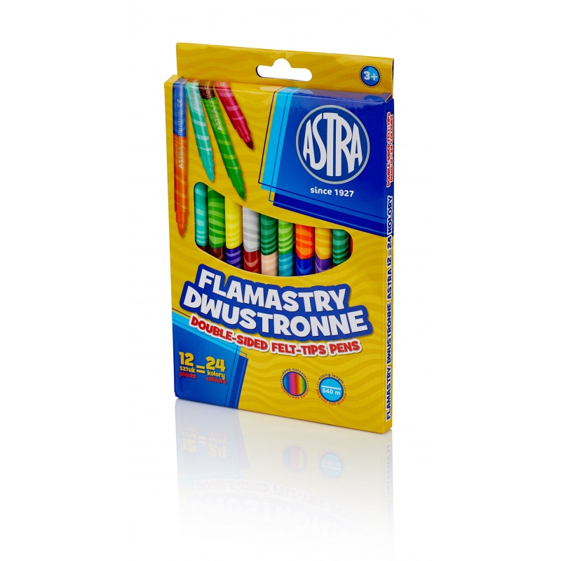 Sada obsahuje 12 ks popisovačů s kuželovitým hrotem, pro kreslení detailů i větších ploch. Fixy jsou oboustranné, jedno plastové tělo obsahuje 2 různé odstíny. Fixy vydrží velmi dlouho, jsou vypratelné z většiny textilií, hrot je odolný vůči zatlačení. Barva je zdravotně nezávadná. Sada je vhodná pro děti školního i předškolního věku. Vyrobeno v Polsku.