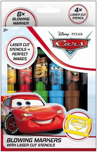 Balení obsahuje 6 barevných foukacích fixů a 4 barevné papírové šablonky v oblíbených pohádkových motivech.