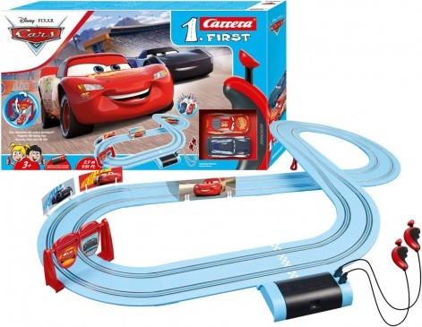 Autodráha Carrera FIRST dlouhá 2,9m s auty Blesk McQueen a Jackson Storm z filmu CARS, pro děti od 3 let, na baterie, obsahuje rovinky, zatáčky, zúžení dráhy pro možné srážky, točící bránu, ovladače a dekorace s tématikou CARS. Obsah balení: 1x auto Blesk McQueen, 1x auto Jackson Storm, rovinky, zatáčky, točící brána pro větší zábavu při průjezdech, 1x napájecí díl, 2x ovladač rychlosti, podpěry, mantinely, návod Autodráha je na baterie 4x C, které nejsou součástí balení. Délka trati: 2,9m Rozměry po sestavení: 114 x 88 cm Vhodné pro děti od 3 let
