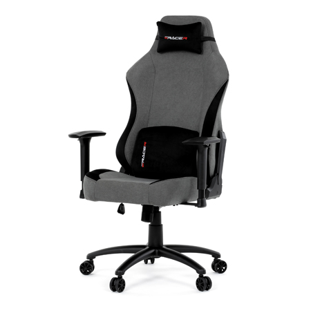 Herní křeslo, šedá látka, houpací mechanismus, polohování opěradla 90°-180°, 3D područky, polštáře z paměťové pěny, nosn