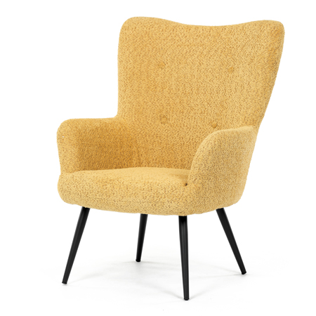 Elegantní křeslo ušák značky Autronic vnese do vašeho obývacího pokoje pohodlí a styl. Žluté čalounění z látky Bouclé působí jemně a moderně, zatímco ergonomicky tvarované područky a opěradlo s jemnými knoflíky zajišťují maximální komfort. Stabilní kovové nohy s černým povrchem dodávají křeslu industriální nádech a zajišťují pevnost i při každodenním používání. Toto křeslo je ideální pro chvíle relaxace s knihou nebo při posezení s přáteli. Díky svému jednoduchému designu snadno zapadne do každého interiéru.