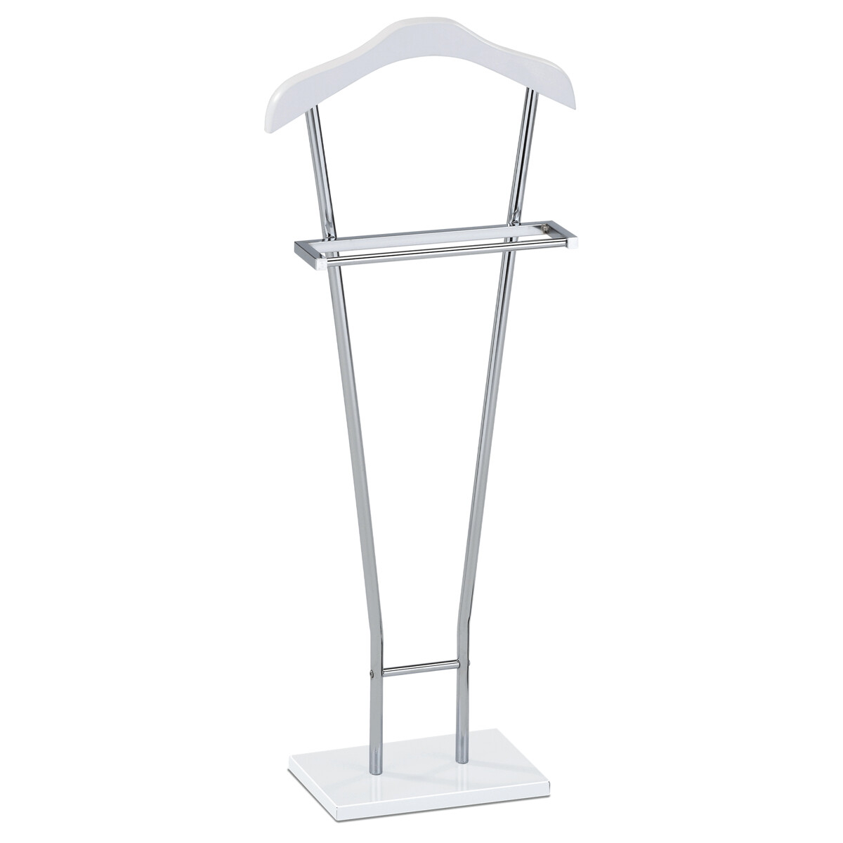 Praktický němý sluha v moderním designu. Konstrukce je kombinací kovových trubek s kovovou podestou a masivního ramene. Povrchová úprava je v bílém matném laku a chromu. Výška 110 cm Vám umožní zavěšení oblečení i doplňků bez pomačkání. Nosnost stojanu je až 6 kg, hmotnost necelé 4 kg. Proto je jednoduše přenositelný a lze ho umístit podle momentální potřeby i nálady. Stylem a jednoduchostí se hodí do jakéhokoli interiéru. Využití je nepřeberné, záleží jen na Vás.