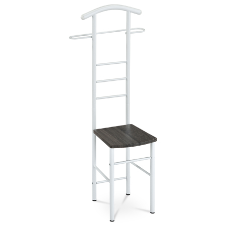 Němý sluha v bílém laku kombinuje kovové tělo s praktickým sedákem z MDF v dekoru černý dub, který dodává celku příjemný kontrast. Výška 119 cm nabízí dostatek prostoru pro zavěšení oděvů či doplňků, zatímco pevná kovová základna zajišťuje stabilitu a nosnost až 90 kg. Design s několika příčkami umožňuje efektivní uspořádání oblečení a doplňků, což z něj činí funkční doplněk do ložnice či předsíně. Povrchová úprava kovu bílým práškovým lakem přispívá k dlouhé životnosti a snadné údržbě. Díky kompaktním rozměrům je vhodný i do menších prostor.
