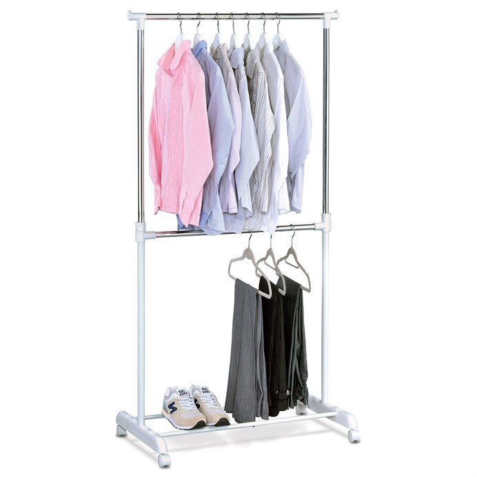 Dvojramenný stojan na šaty v bílé barvě kombinuje kovové a plastové prvky s chromovanými detaily pro moderní vzhled a odolnost. Konstrukce umožňuje nastavení výšky, což zajišťuje flexibilitu při zavěšení různých typů oděvů, od košil až po kalhoty. Spodní odkladač nabízí praktický prostor pro uložení obuvi nebo dalších doplňků, čímž pomáhá udržet pořádek v místnosti. Stabilní základna s kolečky umožňuje snadnou manipulaci a přemístění stojanu podle potřeby. Díky kvalitnímu zpracování a kombinaci materiálů je stojan navržen pro dlouhodobé používání v domácnostech i komerčních prostorách.