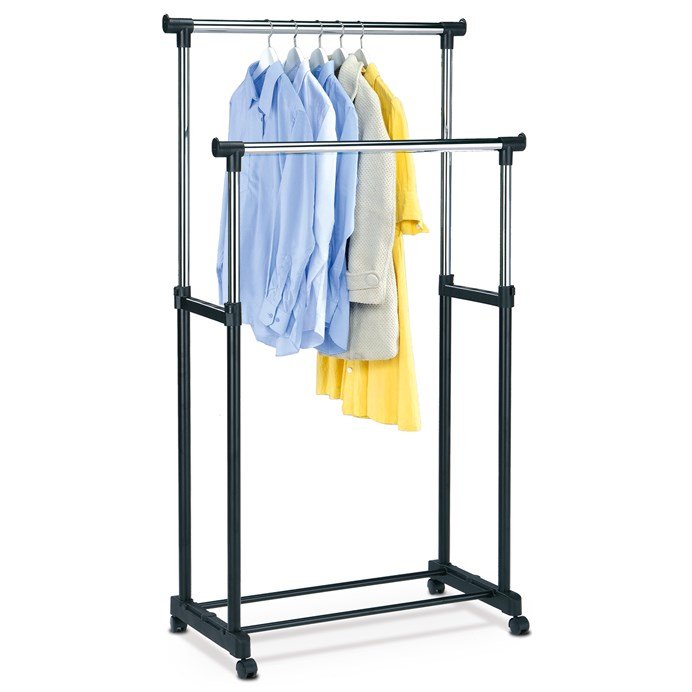 Stojan na šaty dvouramenný se třemi policemi, černá barva, kov / plast, chrom