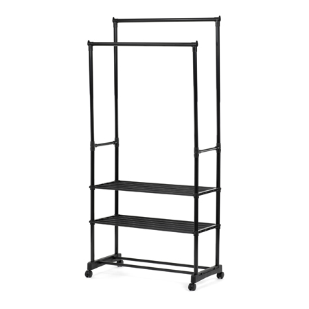 Prostorný stojan na šaty značky Autronic je ideálním pomocníkem pro organizaci vašeho oblečení. Robustní černá kovová konstrukce poskytuje stabilitu a moderní vzhled, zatímco dvě tyče na zavěšení nabízejí dostatek prostoru pro oděvy. Tři spodní police jsou perfektní pro uložení bot, krabic nebo doplňků. Stojan je vybaven kolečky pro snadnou manipulaci a flexibilitu při umístění. Praktický a stylový design z něj činí skvělý doplněk do šatny, ložnice nebo předsíně. Perfektní volba pro přehlednou a funkční organizaci.