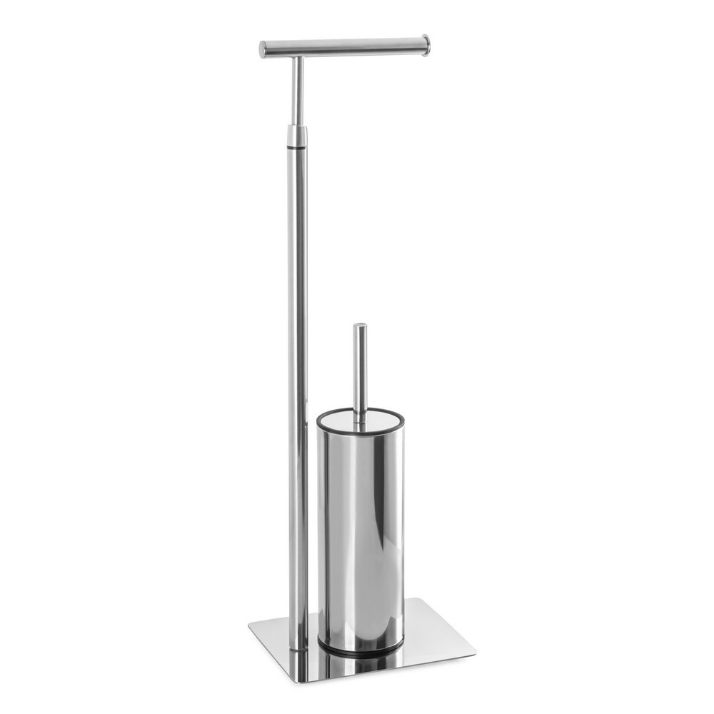 Materiál: chromovaná ocel Rozměry produktu: 22 cm x 71,7 cm x 18 cm Čistá hmotnost: 1,30 kg Popis: Stojan na toaletní papír a držák na WC štětku z chromované oceli s vysoce lesklou stříbrnou povrchovou úpravou je elegantním a funkčním doplňkem každé koupelny. Obsahuje držák na roli toaletního papíru, zatímco v základně je umístěna nádoba na WC štětku. WC kartáč je dodáván se stylovým krytem, který účinně ukryje obsah nádoby a zachová jak hygienu, tak estetiku. Další výhodou je speciálně navržená rukojeť kartáče, která nabízí pohodlné používání a perfektně se přizpůsobí tvaru záchodové mísy. Čisticí hlavice ve tvaru "C" zajišťuje účinné čištění kolem okrajů toalety a poskytuje důkladnou hygienu.
