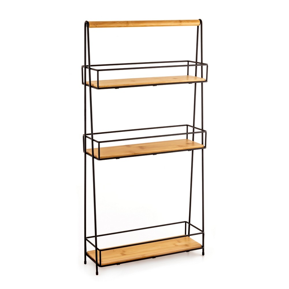 Materiál: lakovaná ocel + bambus Rozměry produktu: 40,5 cm x 80,2 cm x 13,3 cm Čistá hmotnost: 2,93 kg Popis: Regál kombinuje funkčnost a eleganci díky použití tmavě černé lakované oceli a přírodního bambusového dřeva. Obsahuje tři police, včetně jedné vysoké police, která je ideální pro uložení i těch nejvyšších doplňků v různých místnostech, jako je koupelna, kuchyně nebo chodba. Police a tyč v horní části jednotky jsou vyrobeny z bambusového dřeva. Díky kompaktním rozměrům je police vysoce univerzální a vejde se i do menších prostor, přičemž stále nabízí praktické úložné řešení.