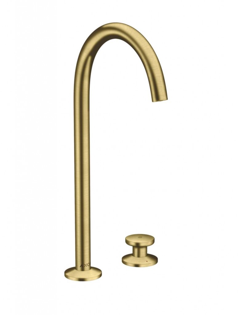 Stojánková umyvadlová baterie barva: kartáčovaná mosaz výška baterie: 355 mm délka výtoku: 165 mm komfortní zóna: 267 mm 2-otvorová stojánková montáž ovládání Select otočný výtok 120° max. průtok při 3 bar: 5 l/min EcoSmart připojení G 3/8" s odtokovou soupravou Push-Open vhodné i pro průtokové ohřívače