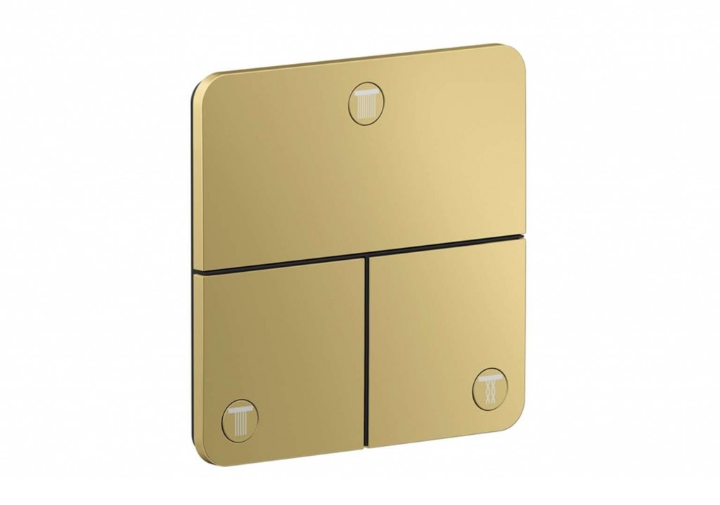 Podomítkový ventil softsquare barva: leštěný vzhled zlata materiál: kov podomítková montáž softsquare rozměr krycí desky: 155 x 155 mm ovládání Select-paddle pro 3 spotřebiče ventil start/stop horní průtok na výstupu: 26 l/min průtok vlevo a vpravo: 26 l/min maximální průtok při 3 barech: 32 l/min min. provozní tlak: 1 bar max. provozní tlak: 10 bar ventil je dodáván s tlačítky Rain Small, Rain Large, Hand shower, Waterfall a MonoRain Montážní těleso není součástí dodávky.