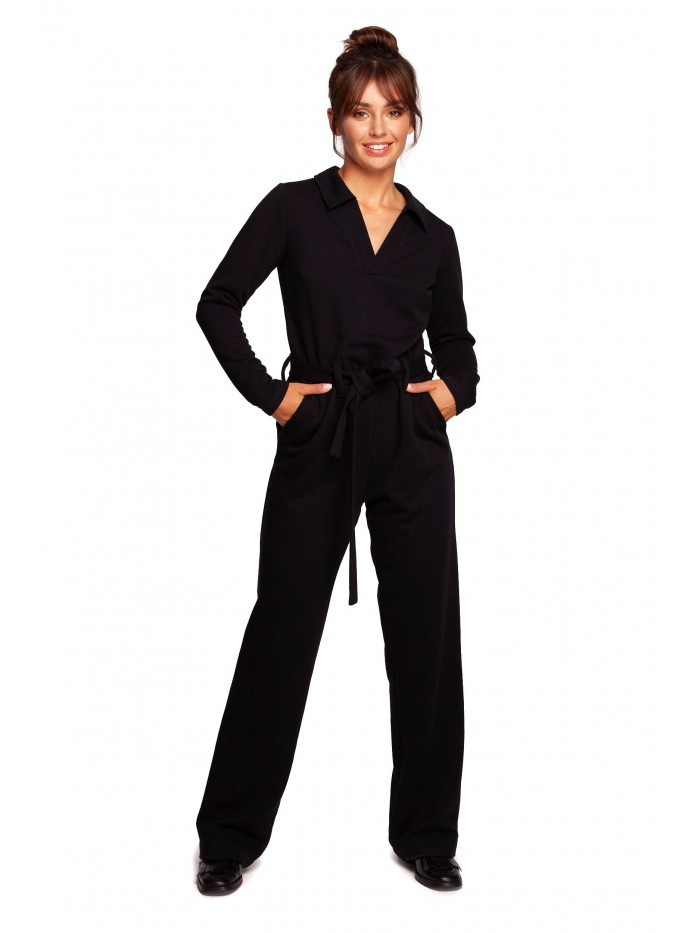 Domů Oblečení a móda Dámské oblečení Dámské halenky a košile B248 Úpletový overal s límečkem a páskem na zavazování - černý EU XXL