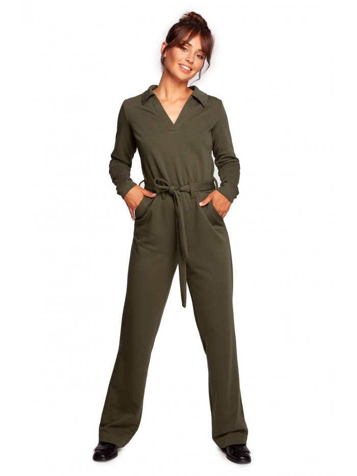 B248 Úpletový overal s límečkem a páskem na zavazování - olivový EU L