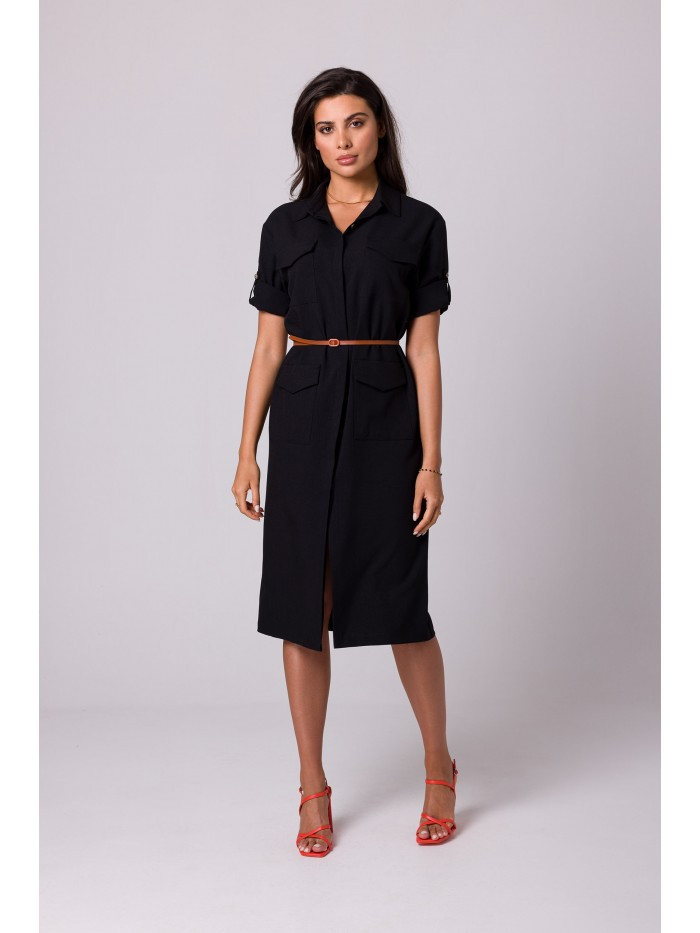 Domů Oblečení a móda Dámské oblečení Dámské šaty B258 Safari šaty s kapsami s klopou - černé EU XXL