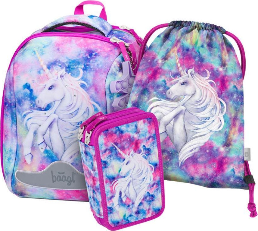 ŠKOLNÍ AKTOVKA SHELLY JEDNOROŽEC • Školní aktovka SHELLY s vyztuženým tělem, vhodná od 1. třídy ZŠ. • Tělo aktovky je tvořeno z pevné výztuže a funguje tedy stejně jako krunýř. Vše uvnitř je bezpečně chráněno. • Dvoukomorový systém pro optimální rozdělení zátěže, přední komora obsahuje praktický organizér s kapsičkou na drobnosti či telefon a karabinu na klíče. • Zádový systém AIR ERGO ADJUSTABLE SYSTEM se skvěle přizpůsobí postavě školáka. Je navržen tak, aby podporoval zdravý vývoj dítěte a bylo zajištěno dostatečné proudění vzduchu podél páteře. • Ergonomicky tvarovaná záda, plně nastavitelné ramenní a prsní popruhy pro optimální přizpůsobení postavě. • Vnitřní organizér umožňující rovnoměrné rozložení hmotnosti. • Boční kapsy z pevné síťoviny, které jsou vhodné pro jednu z našich láhví na pití. • Pevné dno drží stabilní tvar a proto je aktovka samostatně stojící. • Velmi nízká hmotnost aktovky – 1000 g. • Objem aktovky je 23 l a nosnost 6 kg. • Aktovka je vybavena trendy pop it přívěskem. • Aktovky z řady SHELLY byly testovány a certifikovány v akreditované zkušební laboratoři. ŠKOLNÍ PENÁL DVOUPATROVÝ JEDNOROŽEC • Dvoupatrový školní penál se zesíleným hřbetem pro snadnější manipulaci. • Kvalitní gumičky v penálu zvládnou udržet i silné trojhranné pastelky. • Penál obsahuje malou kapsičku na mince či jiné drobnosti. • Penál je bez náplně. SÁČEK NA OBUV JEDNOROŽEC • Sáček na obuv či jiné drobnosti pro vaše volnočasové aktivity. • Sáček je vyroben z pevného omyvatelného materiálu. • Zdrhování pomocí pevných tkanic, které zároveň umožňují nošení na zádech.