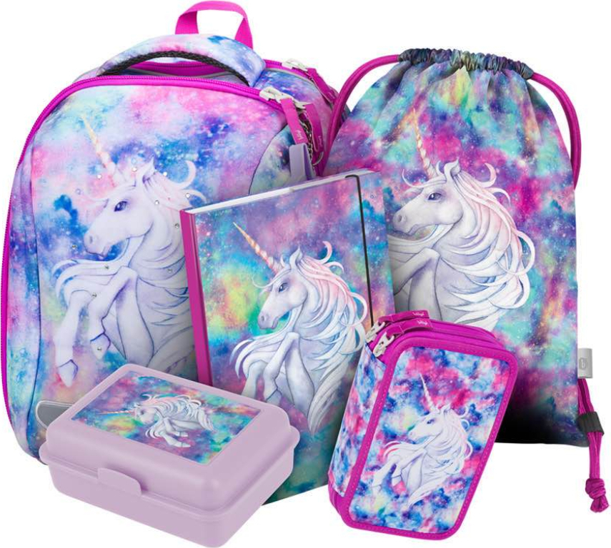 ŠKOLNÍ AKTOVKA SHELLY JEDNOROŽEC • Školní aktovka SHELLY s vyztuženým tělem, vhodná od 1. třídy ZŠ. • Tělo aktovky je tvořeno z pevné výztuže a funguje tedy stejně jako krunýř. Vše uvnitř je bezpečně chráněno. • Dvoukomorový systém pro optimální rozdělení zátěže, přední komora obsahuje praktický organizér s kapsičkou na drobnosti či telefon a karabinu na klíče. • Zádový systém AIR ERGO ADJUSTABLE SYSTEM se skvěle přizpůsobí postavě školáka. Je navržen tak, aby podporoval zdravý vývoj dítěte a bylo zajištěno dostatečné proudění vzduchu podél páteře. • Ergonomicky tvarovaná záda, plně nastavitelné ramenní a prsní popruhy pro optimální přizpůsobení postavě. • Vnitřní organizér umožňující rovnoměrné rozložení hmotnosti. • Boční kapsy z pevné síťoviny, které jsou vhodné pro jednu z našich láhví na pití. • Pevné dno drží stabilní tvar a proto je aktovka samostatně stojící. • Velmi nízká hmotnost aktovky – 1000 g. • Objem aktovky je 23 l a nosnost 6 kg. • Aktovka je vybavena trendy pop it přívěskem. • Aktovky z řady SHELLY byly testovány a certifikovány v akreditované zkušební laboratoři. ŠKOLNÍ PENÁL DVOUPATROVÝ JEDNOROŽEC • Dvoupatrový školní penál se zesíleným hřbetem pro snadnější manipulaci. • Kvalitní gumičky v penálu zvládnou udržet i silné trojhranné pastelky. • Penál obsahuje malou kapsičku na mince či jiné drobnosti. • Penál je bez náplně. SÁČEK NA OBUV JEDNOROŽEC • Sáček na obuv či jiné drobnosti pro vaše volnočasové aktivity. • Sáček je vyroben z pevného omyvatelného materiálu. • Zdrhování pomocí pevných tkanic, které zároveň umožňují nošení na zádech. BOX NA SVAČINU JEDNOROŽEC • Plastový box na svačinu ve fialové barvě. • Box má uzavírání na jeden zámek a dělicí přepážku. • Nedoporučujeme mýt v myčce. DESKY NA ŠKOLNÍ SEŠITY A4 JEDNOROŽEC • Ochranné desky na úschovu sešitů či jiných dokumentů, včetně vnitřní klopy proti vypadnutí, zajištěné gumičkou.