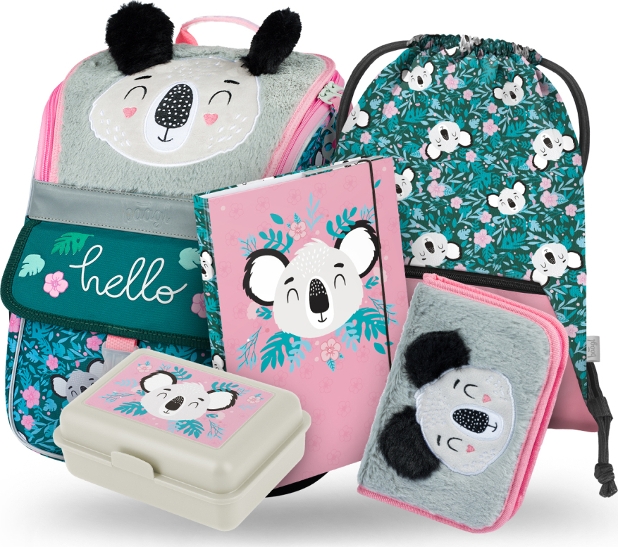 "ŠKOLNÍ AKTOVKA ZIPPY BABY KOALA • Ergonomická školní aktovka s vyztuženým tělem, vhodná od 1. třídy ZŠ. • Posuvný zádový systém ERGO ADJUSTABLE SYSTEM umožňuje nastavení optimální polohy popruhů vzhledem k výšce dítěte. • Ergonomicky tvarovaná záda, plně nastavitelné ramenní, prsní a boční kompresní popruhy pro optimální přizpůsobení postavě. • Aktovka disponuje novým vyklápěcím systémem otevírání, díky kterému se školák snadněji dostane ke svým pomůckám přímo z lavice. • Uvnitř aktovky je průhledná kapsa na rozvhr a vnitřní organizér umožňující rovnoměrné rozložení hmotnosti, doplněný gumičkou pro fixaci. • Boční kapsy z pevné síťoviny, které jsou vhodné pro jednu z našich láhví na pití. • Izolovaná prostorná přední kapsa se zapínáním na přezku. • Lehká konstrukce drží stabilní tvar aktovky, hmotnost aktovky – 1 100 g. • Objem aktovky je 18 l a nosnost 6 kg. • Tělo aktovky je vyrobené z pevného voděodolného materiálu. • Dno aktovky je vyrobené z pevného materiálu, díky kterému aktovka samostatně stojí. • Reflexní prvky pro bezpečnost dítěte. • Aktovka je vybavena plyšovým přívěskem. • Aktovky z řady ZIPPY byly testovány a certifikovány v akreditované zkušební laboratoři. ŠKOLNÍ SÁČEK BABY KOALA • Sáček na obuv či jiné drobnosti pro vaše volnočasové aktivity. • Sáček je vyroben z pevného omyvatelného materiálu a v jeho dolní části je umístěna praktická kapsička na zip. • Sáček je vybaven karabinkou díky, které ho lze připevnit na aktovku. • Zdrhování pomocí pevných tkanic, které zároveň umožňují nošení na zádech. ŠKOLNÍ PENÁL KLASIK DVĚ CHLOPNĚ BABY KOALA • Klasický školní jednopatrový penál s dvěma chlopněmi. • Uzamykatelný na kvalitní zip. • Bez náplně. BOX NA SVAČINU BABY KOALA • Plastový box na svačinu v krémové barvě. • Box má uzavírání na jeden zámek a dělicí přepážku. • Nedoporučujeme mýt v myčce. DESKY NA ŠKOLNÍ SEŠITY A4 BABY KOALA • Ochranné desky na úschovu sešitů či jiných dokumentů, včetně vnitřní klopy proti vypadnutí, zajištěné gumičkou.