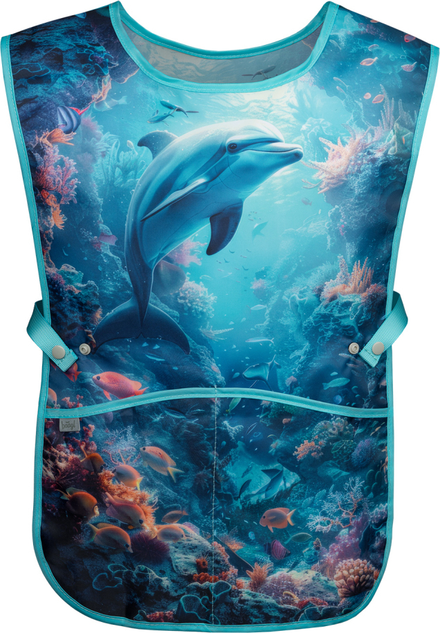 • Dětská zástěra na výtvarnou výchovu, pracovní činnosti a další kroužky. • V dolní části zástěry jsou dvě kapsy. • Vyrobeno z omyvatelného materiálu.