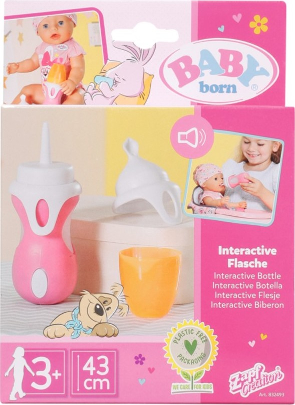 "Kdo potřebuje celou kuchyňskou skříň plnou nádobí? Panenka BABY born určitě ne. Má svou lahvičkou s integrovanou lžičkou. Jeden nástavec se používá na pití, při kterém je slyšet zvuk sání. Druhý nástavec je zakončen lžičkou. Kaše pro panenku BABY born se z lahvičky vytlačí otvorem ve spodní části nástavce se lžičkou a vše je připraveno k jídlu. Dobrou chuť! • Kvalitní příslušenství pro originální panenku BABY born. • Pro radost z nápadité, rozmanité a dlouhotrvající hry. BABY born Interaktivní lahvička a lžička pro panenky velikosti 43 cm se dvěma nástavci a zvukovými efekty. "