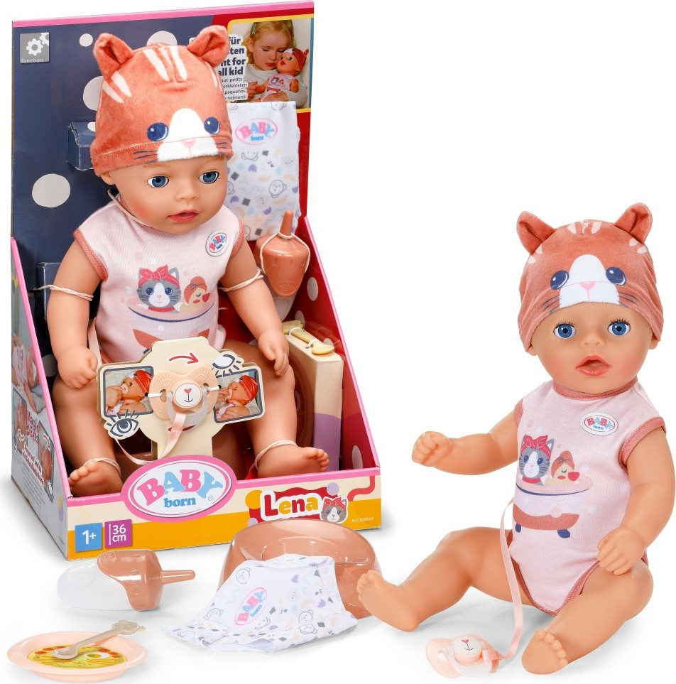 BABY born Lena Kočička je ideální první panenka pro děti od 1 roku. Díky své kompaktní velikosti 36 cm a 7 jednoduchým funkcím se snadno drží – perfektní pro malé dětské ruce a první hraní s panenkou. Lena funguje zcela bez baterií a přináší vše, co potřebujete. Umí pít z lahvičky, čůrat do látkové plenky nebo chodit na nočník. Po kontaktu s vodou se plenka zbarví a ukáže žluté srdíčko. Milý detail, který přispívá k realistické hře. Když dostane svůj dudlík, který je připevněný k jejím dupačkám s roztomilým kočičím motivem, kouzelně otevírá a zavírá oči. Otočením dudlíku doleva zavře oči, otočením doprava je zase otevře. Když ji položíte do postýlky, zavřou se oči i bez dudlíku, jako by opravdu spala. Její pohyblivé ruce a nohy a otočná hlava usnadňují oblékání a svlékání. Díky menší velikosti a jednoduchým funkcím je Lena ideální pro malé dětské ručičky a zve k zábavné hře při krmení, přebalování a uspávání. • Umí pít, čůrat do plenky, chodit na nočník a může se i koupat • Když dostane svůj dudlík, kouzelně otevírá a zavírá oči, ať už sedí nebo leží • Díky menší velikosti a nižší hmotnosti je vhodná jako první panenka i pro malé děti