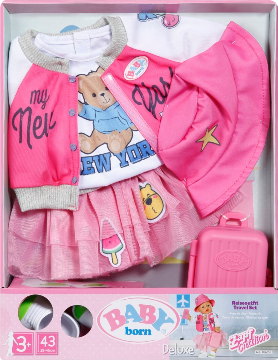 Tento outfit promění letiště v přehlídkové molo: cestovní oblečení BABY born skládající se z bundy, trička, tylové sukně, bot a čepice je dokonale sladěno. Myslelo se i na kufr – i ten se k oblečení perfektně hodí. Nezapomeňte si cestovní pas a přejeme šťastný let! • Sada se skládá z bundy, trička, tylové sukýnky, čepice a bot • S kufrem a cestovním pasem • Vhodné pro panenky velikosti 43 cm • Kvalitní oblečení a doplňky pro radost z nápadité, rozmanité a dlouhotrvající hry