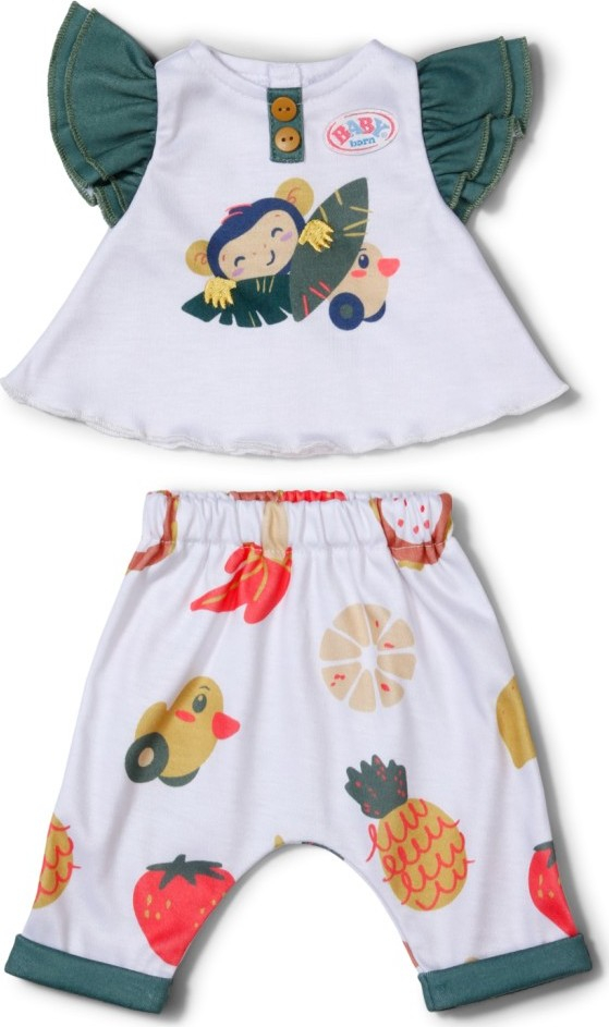 Z trička se zelenými volánkovými rukávy se na tebe usmívá roztomilá opička mezi dvěma banánovými listy. Kalhoty, které k tričku skvěle ladí, jsou potištěny obrázky různých druhů ovoce a kačenky Berty. • Sada trička a kalhot • Tričko i kalhoty jsou ozdobeny roztomilým potiskem opičky, kačenky Berty a ovoce • Tričko s knoflíky a volánkovými rukávy • Vhodné pro panenky velikosti 43 cm a pro medvídky BABY born Teddy • S ramínkem z recyklovaného materiálu • Kvalitní doplněk pro radost z nápadité, rozmanité a dlouhotrvající hry