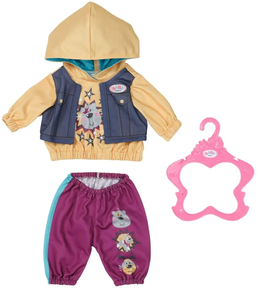 To je to, co se nosí v naší Hood… Hood je odvozeno z anglického slova Neighborhood a popisuje místo, kde se scházíte se svými kamarády. BABY born streetové oblečení se skládá ze žluté mikiny s kapucí a ležérních tepláků. Horní díl s kapucí je 2v1 – mikina s našitou vestou v džínovém vzhledu. Kalhoty v ostružinové barvě stejně jako přední část mikiny jsou ozdobeny legračními zvířecími potisky. • Kvalitní oblečení pro originální panenku BABY born. • Pro radost z nápadité, rozmanité a dlouhotrvající hry. BABY born Oblečení s mikinou pro panenky velikosti 43 cm. Součástí je mikina a kalhoty. Včetně ramínka.