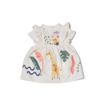 Volné, lehké a hravé! Tyto šaty inspirované safari jsou ozdobeny volánky na rukávech a obrázkem žirafy mezi dalšími motivy džungle. Jsou ideální pro slunečné dny. Roztomilé letní šaty s volánkovými rukávy a s motivy džungle Vhodné pro panenky velikosti 43 cm a pro medvídky