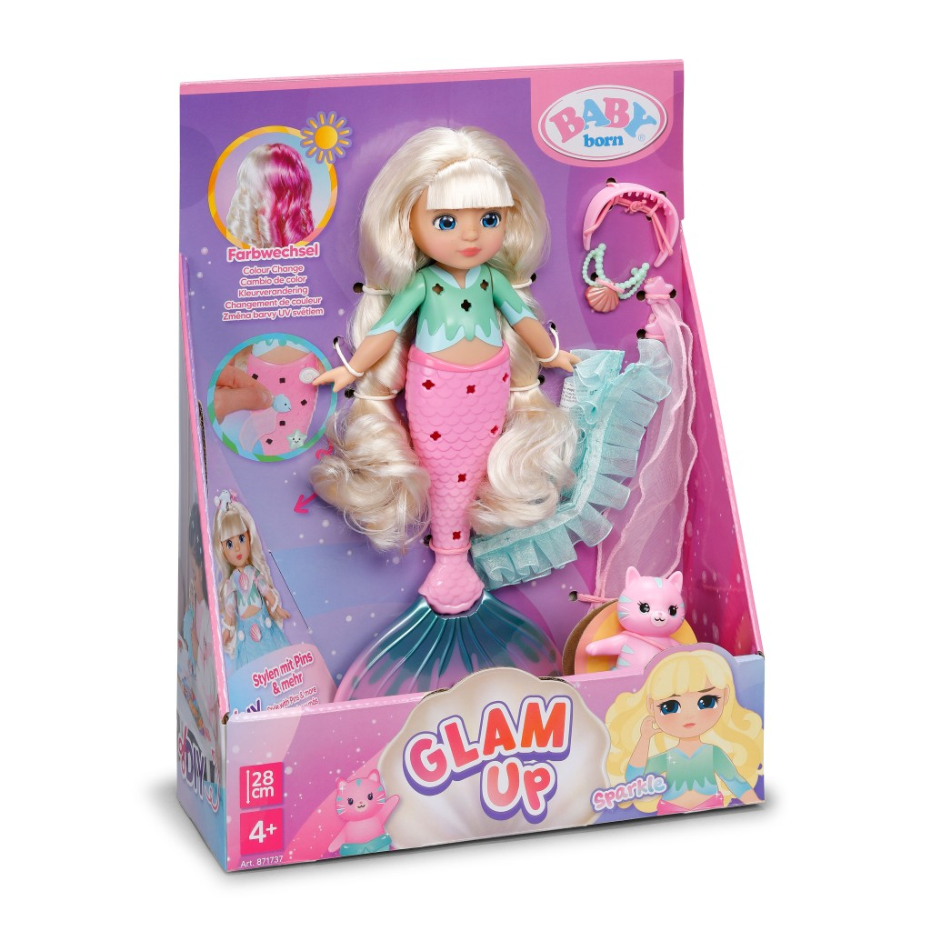 Vítejte ve světě BABY born Glam Up! Zde se vše točí kolem kreativity, třpytu a nekonečných možností tvoření. Glam Up mořské víly zvou děti, aby rozvíjely svou fantazii a každý detail upravovaly podle vlastního vkusu. Pokaždé jinak a originálně. Mořská víla Sparkle miluje proměny a hraní si s barvami. Od hlavy až po ploutev ji lze česat, zdobit a dekorovat podle vlastního stylu. Díky přiloženým textilním doplňkům, barevným nacvakávacím ozdobám a roztomilému zvířátku s odnímatelnou ploutví vznikají pokaždé nové vzhledy. Přiložená brožurka inspiruje k dalším nápadům i s materiály, které mají děti doma. Obzvlášť kouzelné jsou dlouhé blond vlasy Sparkle, které na slunci mění barvu a přinášejí skutečný wow efekt. Ať už jde o třpytivé účesy, kreativní dekorace nebo hry plné fantazie s BABY born Glam Up Sparkle objevují děti nekonečné možnosti tvoření a mohou nechat svou kreativitu volně plynout. • Sparkle – Glam Up mořská víla s magickým UV barevným efektem • Blond vlasy mění na slunci barvu • Celou postavičku lze upravovat – od účesu až po ploutev • S textilními doplňky, barevnými nacvákavacími ozdobami, roztomilým zvířecím kamarádem a deníčkem plným inspirace • Pro kreativní česání, zdobení a hry plné fantazie • Vhodné pro děti od 4 let – kreativní zábava se stylingem a účesy plná lesku